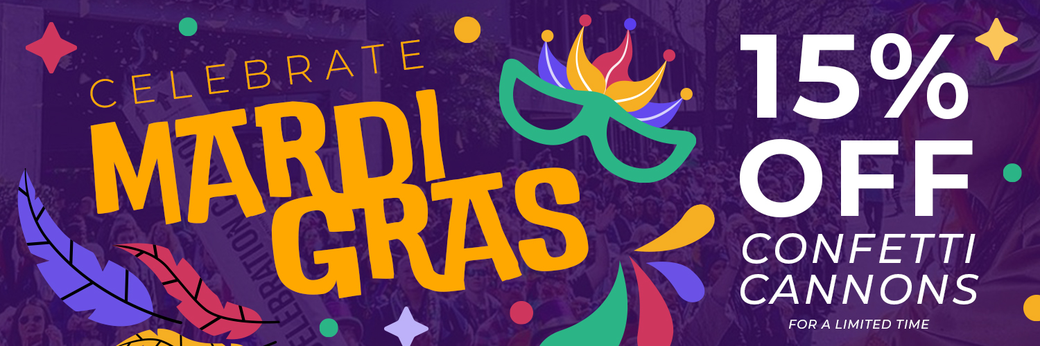 Get 15% off your confetti cannons for a limited time only and make your 2025 Mardi Gras one for the books. Pick your colors, stock up, and let the good times roll — your krewe will thank you!