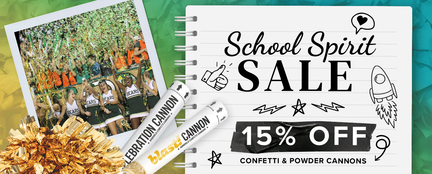 Make every pep rally, homecoming, and senior night unforgettable. For a limited time, get 15% off Confetti Cannons and Powder Cannons. No code needed—the discount appears in your cart at checkout.